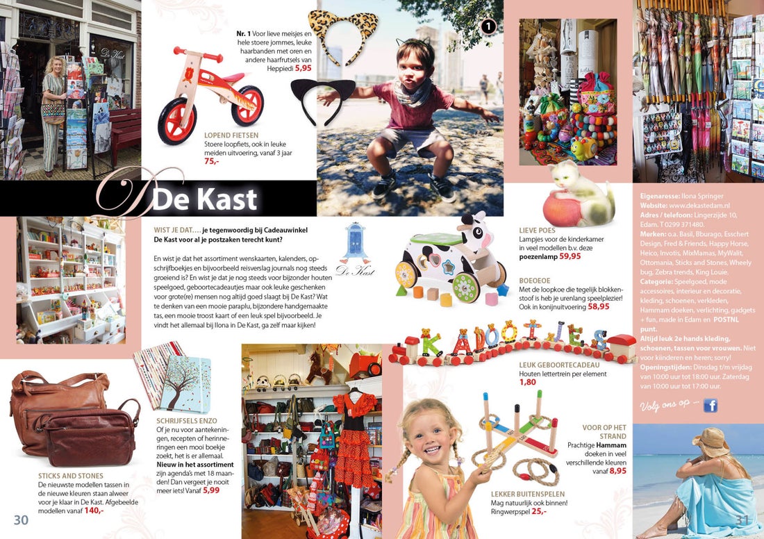 De Kast in Edam. De leukste cadeauwinkel voor geboortecadeautje, cadeautje voor kinderen en volwassenen. Dat kun je wel een beetje zien met deze onderstaande afbeelding waarmee we afgelopen jaar in De VerrassendWinkelen glossy van Edam-Volendam stonden. Natuurlijk kun je makkelijk bestellen via deze webshop maar je mag natuurlijk ook altijd even langskomen en binnenwippen....We hebben nog zoveel meer leuke spulletjes. Maar gemak dient de mens dus aarzel niet en bestel gemakkelijk via deze shop en betaal veilig via iDeal. En als je in Edam of Volendam woont komen we het zelf langsbrengen zonder extra kosten.